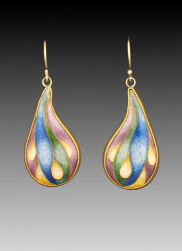 Есть очень красивая и интересная техника, называемая перегородчатая эмаль (clossonne enamel). До недавнего времени я видела работ грузинских мастеров в данной технике, имею несколько комплектов украшений в данной технике. На просторах интернета попались очень, ну очень красивые работы мастера Sheila Beatty в данной технике. Сама техника перегородчатой эмали состоит в нанесение на серебряной пластине тонкими серебряными или золотыми отрезками проволоки определенного рисунка. Созданные с помощью проволоки отрезка заполняются эмалью, каждый слой нанесенной эмали обжигается в печи при высокой температуре. При создании украшений могут использовать различные техники (например, использование фольги), для получения определенных зон, которые просвечиваются через эмаль. Работы очень красивые!!!